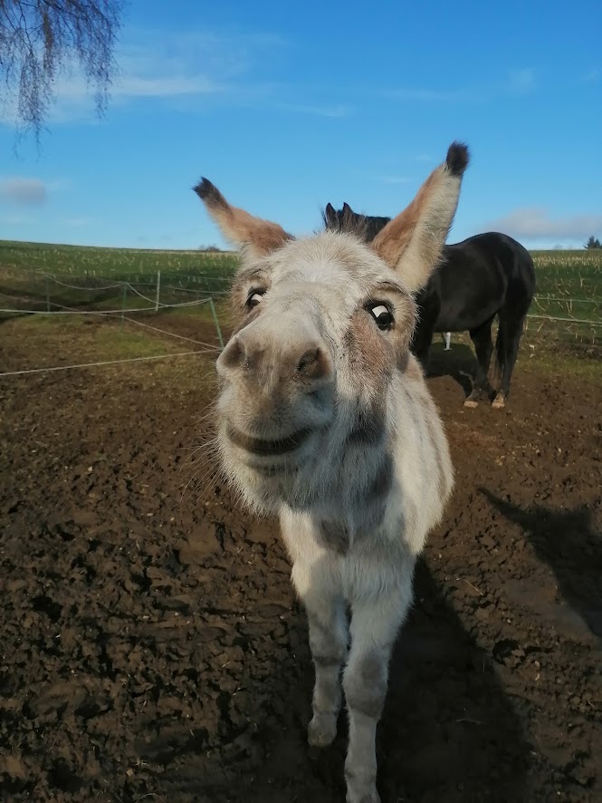 Ich bin Nuck und am 02.5.2018 geboren. Mit 10 Monaten kam ich zu Bettina. Anfänglich war Aragon, Bettinas Pferd, mein Gefährte bis nach einigen Monaten Jens zu mir gezogen ist. Für mich bietet die Welt noch jeden Tag viele spannende und neue Erfahrungen. Und ich bin neugierig auf jede einzelne! Ich lerne gerne Tricks und kann diese meist schon nach wenigen Wiederholungen. Wenn Bettina mir etwas zeigt bin ich aufgeschlossen und mutig. Manchmal habe ich auch meinen eigenen Kopf und denke mir lieber selbst ein Spiel aus. Ich begegne gerne neuen Menschen und zeige Dir wie lustig Esel sein können!